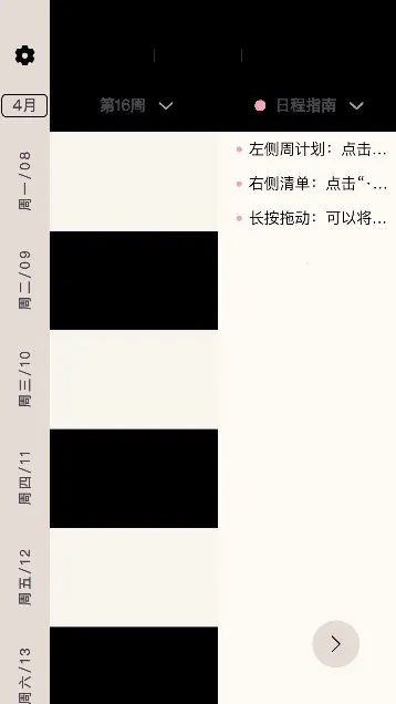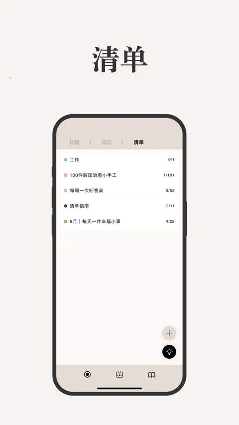 日程管理提供周计划视图,方便填写每日计划。清单管理有多种类型清单,支持多清单并行,自动记录进度。日记记录采用一日一页,支持多种输入方式,还能自动生成任务完成卡片。