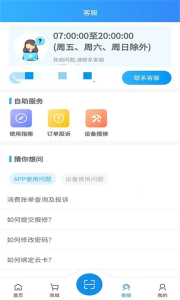 2. 提供清晰多样的自助客服服务,其中有使用指南、订单投诉以及设备报修多种服务工具,满足用户各种需求。