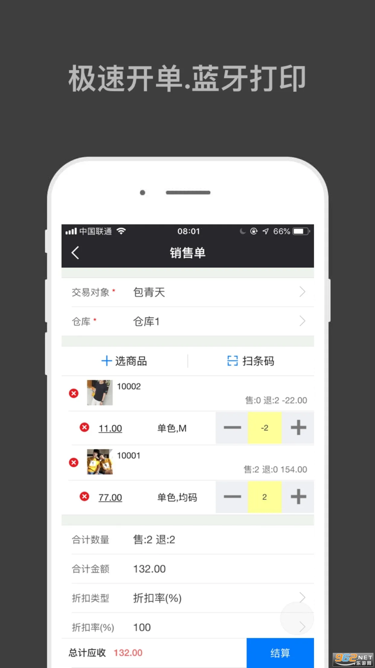 操作简便:界面美观大方,操作简单,10秒快速帮您销售入库,让您随时随地开单记账,轻松管理客户、库存和店铺。