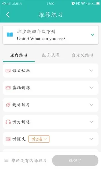 4. 练习选择灵活多样,实时在线推荐,可根据教学需要灵活选择听力、口语、绘本等多种练习,满足不同教学需求。