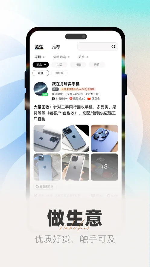 侠客汇是一款专注于二手B2B社交贸易的移动应用。它能帮上游卖家高效散货,快速消化库存,缩短商品流转时间;为下游买家提供优质货源,满足对高品质二手数码产品的需求。