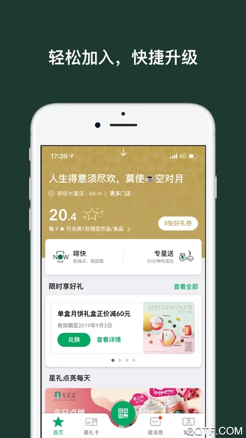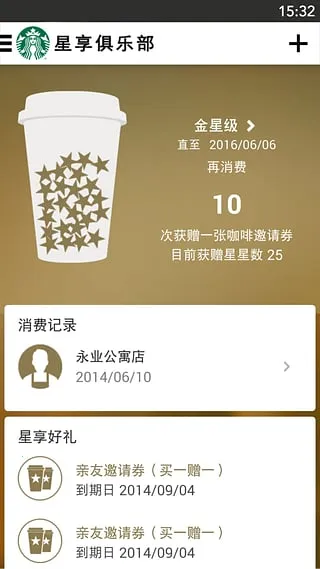 4. 拥有星享俱乐部,可随时随地查看星享卡消费记录、会员等级、星星数量及星享好礼;能精确发现星巴克门店,及时获知新产品和推广活动信息。