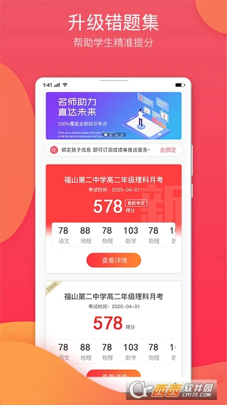 3. 强大学习辅助与家长管理功能:通过知识点漏洞精准分析形成学习图谱,让孩子查漏补缺更有针对性。家长可查看学生考试成绩、各科等级位置、偏科分析、错题统计等,还能整理历次考试错题,方便孩子随时随地下载练习。