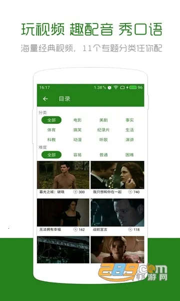 2. 学习方式轻松趣味,每日更新热门英语经典视频,通过为电影动漫等视频配音,让您不知不觉开口说英语,掌握地道标准发音。