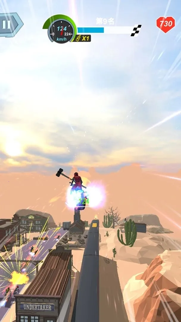 2. 玩法丰富,融合竞速与打斗,紧张刺激,趣味性与挑战性十足。赛道上不仅能激烈追逐,还能拾取武器攻击对手,途中要躲避对手攻击与障碍物,还可做特技表演。