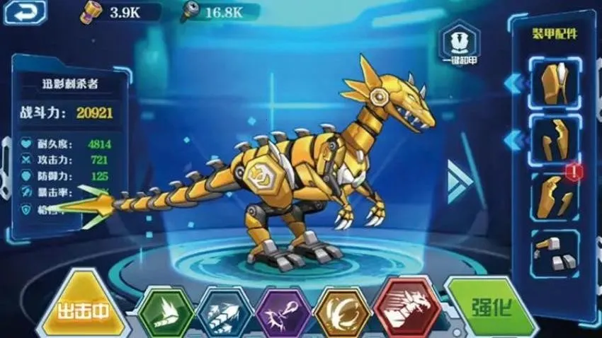 自由组装,创造无限可能。游戏提供数十种不同零件,每个零件形态独特且拥有不同战斗属性和星级评分。玩家可自由融合恐龙强悍元素和载具高机动性,兼顾外观与实力,打造专属机甲,每场战斗策略需求不同,乐趣与挑战并存。