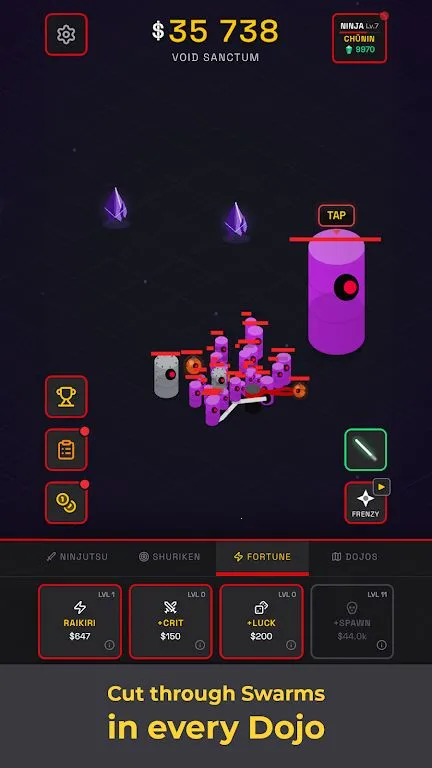 3. 持续成长体验:击杀敌人、挑战密集敌人和收集宝物赚取金币进行永久升级,提升伤害、攻击速度、机动性和整体战斗力。完成任务获取经验值,从下忍晋升为忍者,每次挑战解锁新内容。