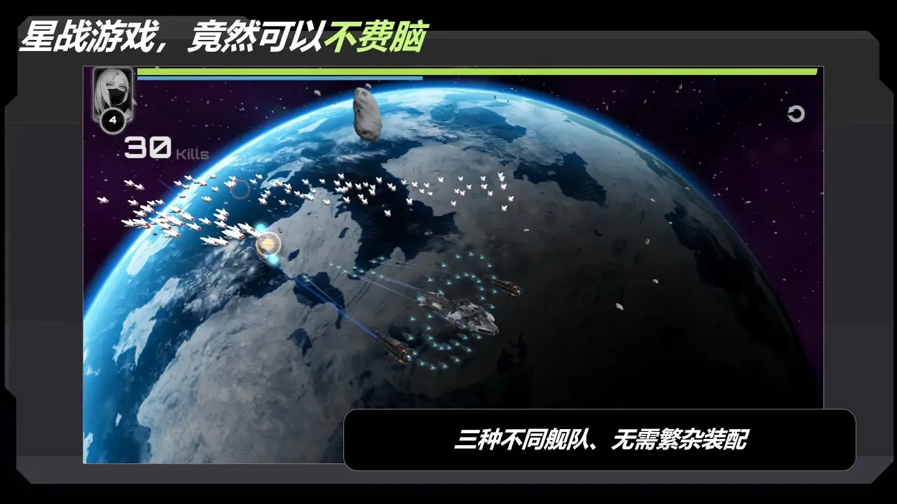 2. 可从三支不同舰队中挑选一支,一根手指就能实时控制整个舰队,与无穷无尽的敌人展开战斗,带来独特操控体验。