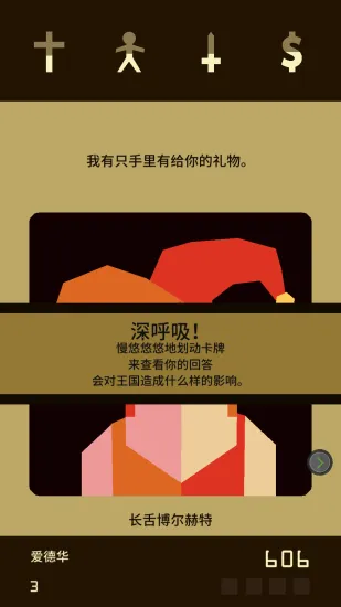 2、深度策略权衡:以指尖轻划掌控王国命运,每次滑动都是对宗教、民生、军事与财政四大势力的精密权衡,在混沌中维系脆弱平衡。